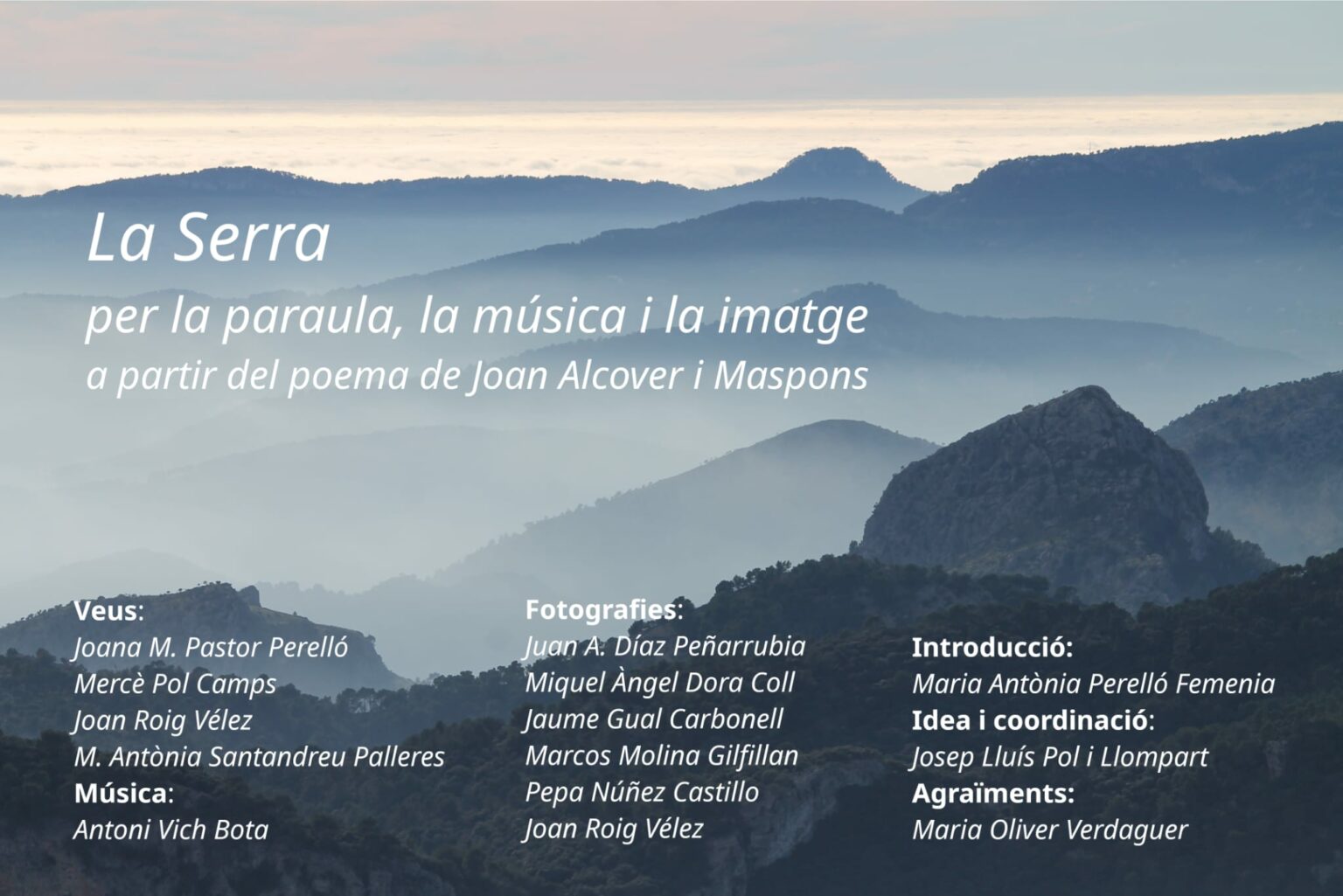 El muntatge audiovisual proposa una lectura declamada del poema “La Serra”, estructurada en set fragments. Les veus aniran a càrrec de Joana M. Pastor Perelló, Mercè Pol Camps, Joan Roig Vélez i M. Antònia Santandreu Palleres. Entre cada un dels fragments, sis fotògrafs -Juan A. Díaz Peñarrubia, Miquel Àngel Dora Coll, Jaume Gual Carbonell, Marcos Molina Gilfillan, Pepa Núñez Castillo i Joan Roig Vélez- oferiran la seva interpretació visual de La Serra, establint un diàleg entre poesia i imatge.