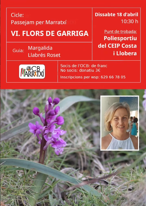 Margalida Llabrés Roset ens guiarà per un itinerari on coneixerem de prop l’hàbitat de les garrigues, identificarem les flors principals i aprendrem detalls i curiositats botàniques. La passejada s’emmarca en el cicle anomenat “Passejam per Marratxí”. Imprescindible apuntar-se per wsp al 629667805.