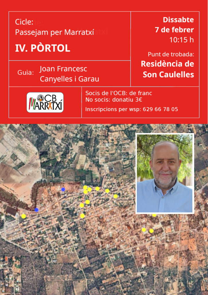En el marc del cicle “Passejam per Marratxí” Joan Francesc Canyelles i Garau ens guiarà pels carrers i la història de Pòrtol. És imprescindible la inscripció per wsp al 629667805. Durada: 2 hores,