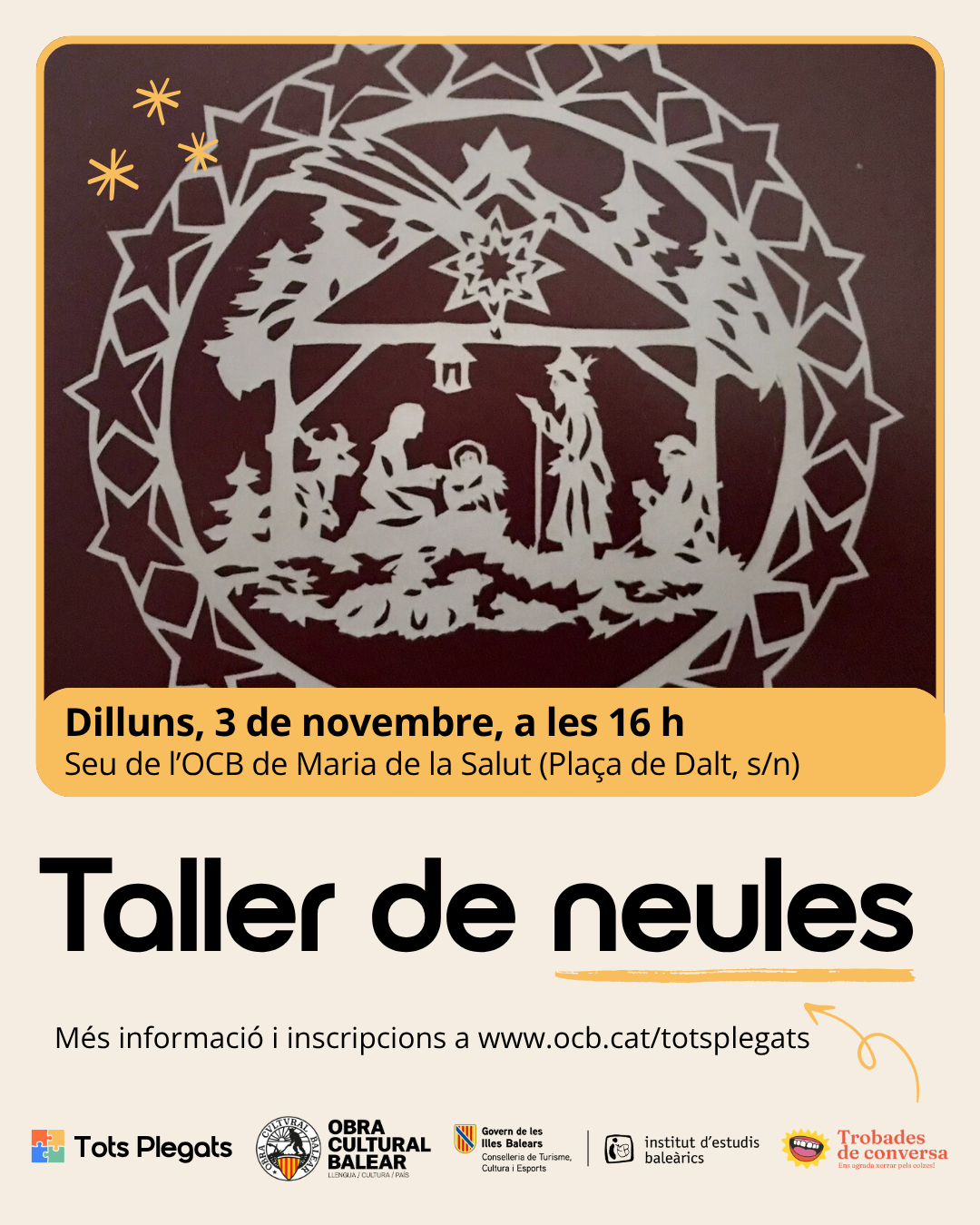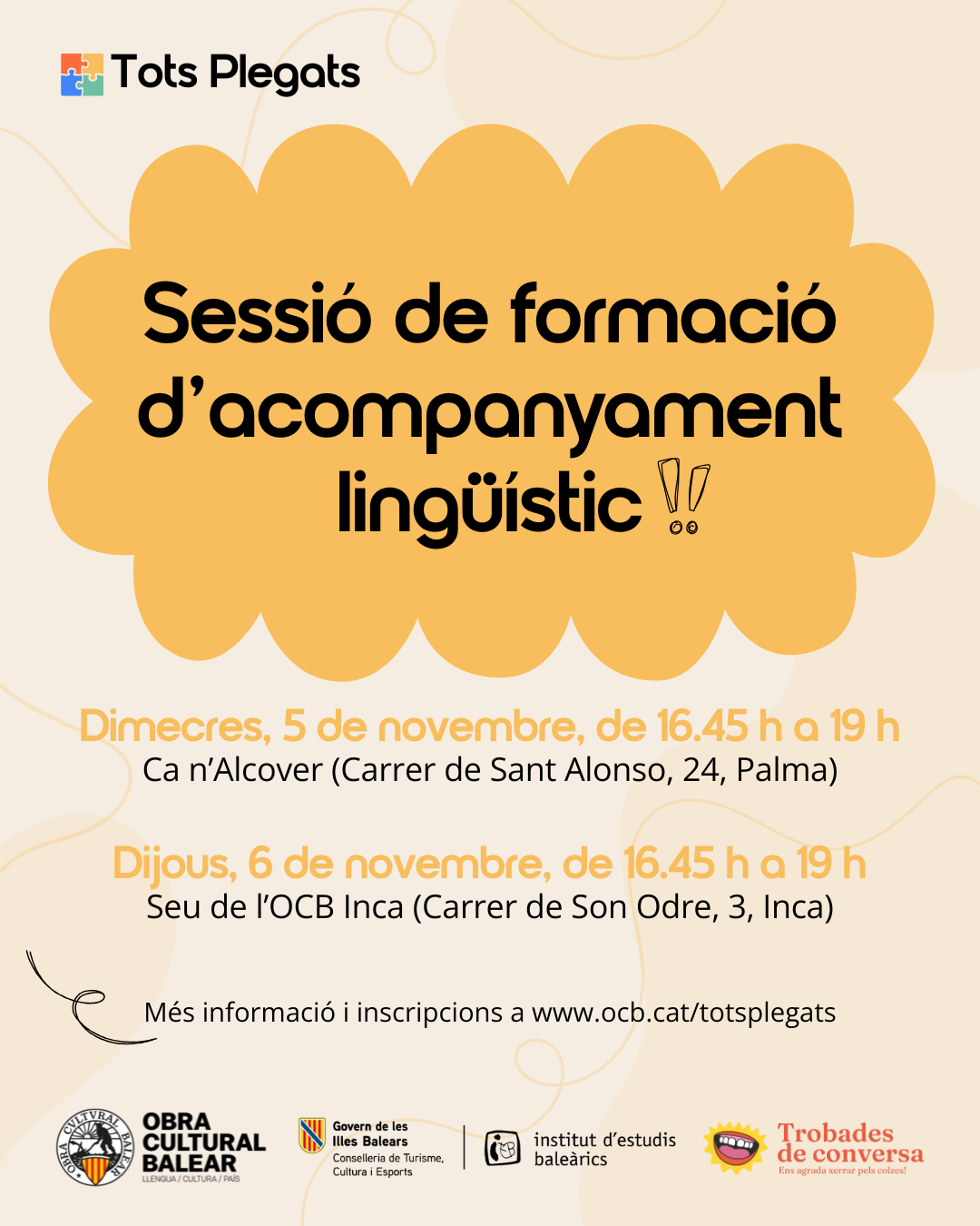 Inca – Seu de l’OCB Inca (Carrer de Son Odre, 3) En el marc del projecte Tots Plegats, impulsat per l’Obra Cultural Balear, amb el suport de l’IEB, s’ofereix una sessió formativa d’acompanyament lingüístic adreçada a totes les persones voluntàries que vulguin participar en el foment de l’ús social del català. Aquesta formació té […] |