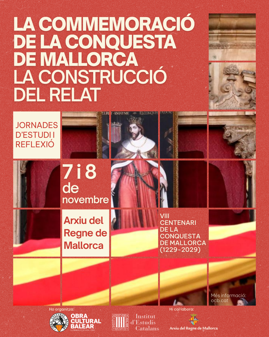 L’OCB organitza, en el marc del vuitè centenari de la conquesta de Mallorca (1229-2029), unes jornades d’estudi i de reflexió sobre la commemoració de la conquesta de Mallorca i la construcció del relat. Les jornades es duran a terme els dies 6 i 7 de novembre a l’Arxiu del Regne de Mallorca.