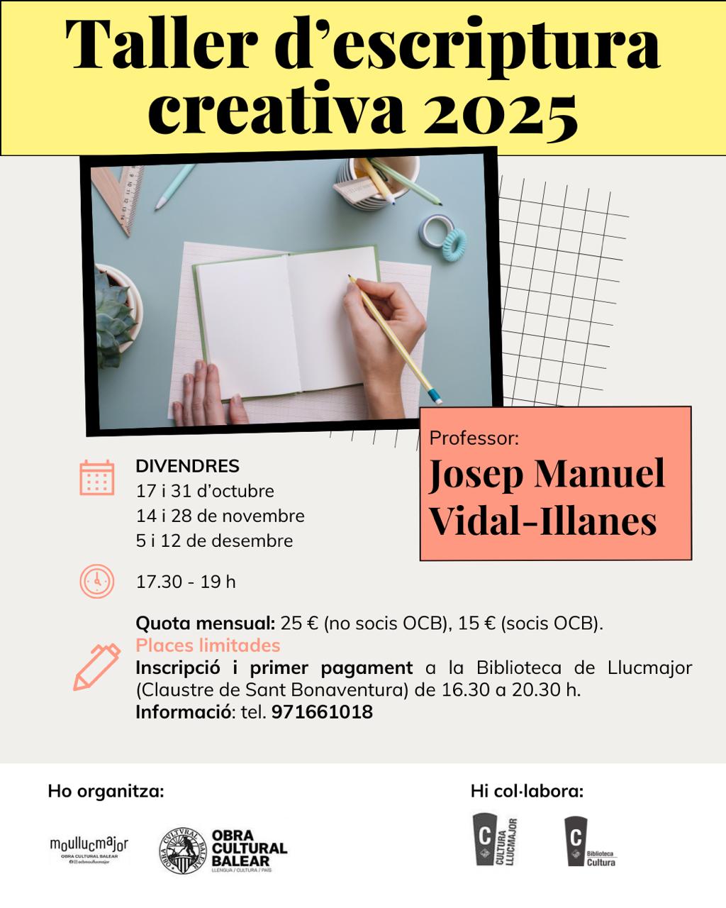 ![]() Andratx – Rectoria de l’Esglèsia d’Andratx Modalitat: lectura compartida. Dijous, 18 i 25 de setembre. Dijous, 2 i 9 d’octubre. 19 hores. Facilitadora: Lina Mira. Divendres 10 d’octubre. 20 hores. Degustació de vi i poesia. Inscripcions: obraculturalandratx@gmail.com Activitat gratuïta. |